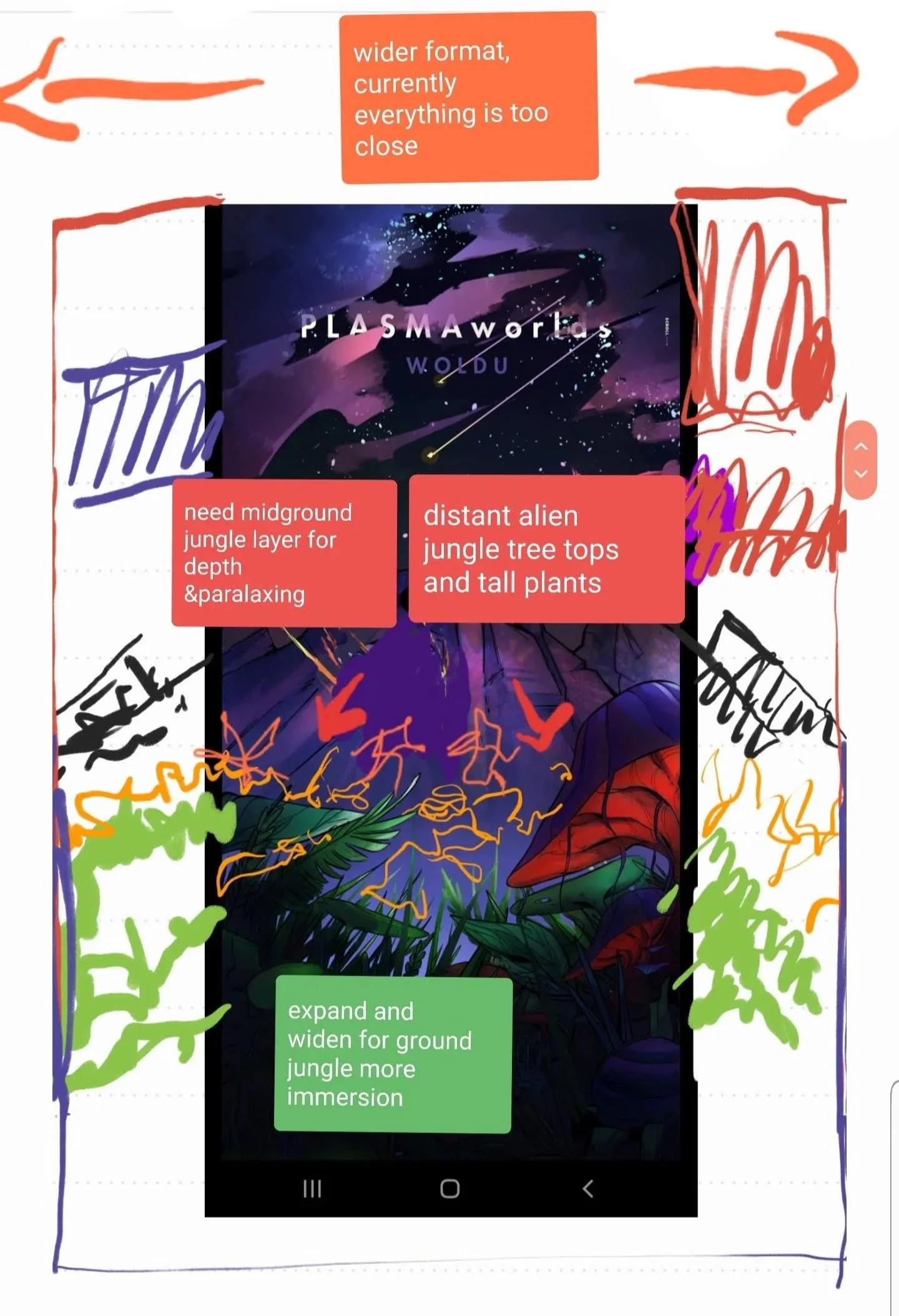 Back in 2018 a very talented Web developer named I’d recently met named JD reached out with an idea. He expressed that he was excited to test a new technology for interactive websites. He said we could overlap and overlay images in the same he’d noticed I had been developing my animations - 2D parallax style. The difference here is the animation would take place as the finger scrolls or the twist of a mouse wheel, that is how the animation will active and progress. I thought it was an interesting idea and I got right to sketching designs on my phone - with my Samsung note and screen pen. Though the words are not so easily legible, you get the idea - I broke the site scene into 3 levels (scenes).