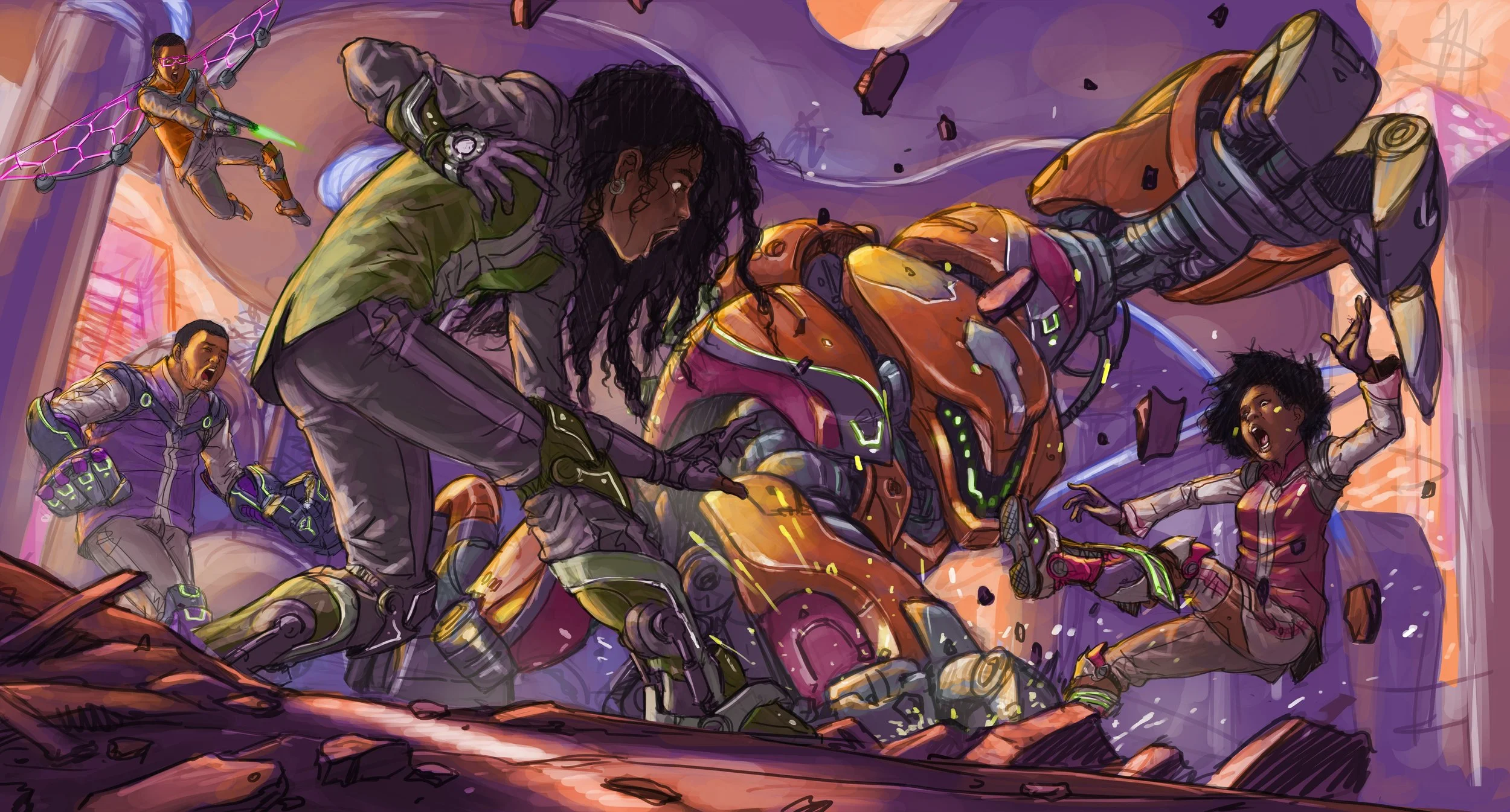 Action scene creation here. Exciting times. Who doesn’t love a scenario where a bunch of heroes are in battle with a boss monster? Here, you can check out the process here. Fernando and I rocked out on this one. As follows -